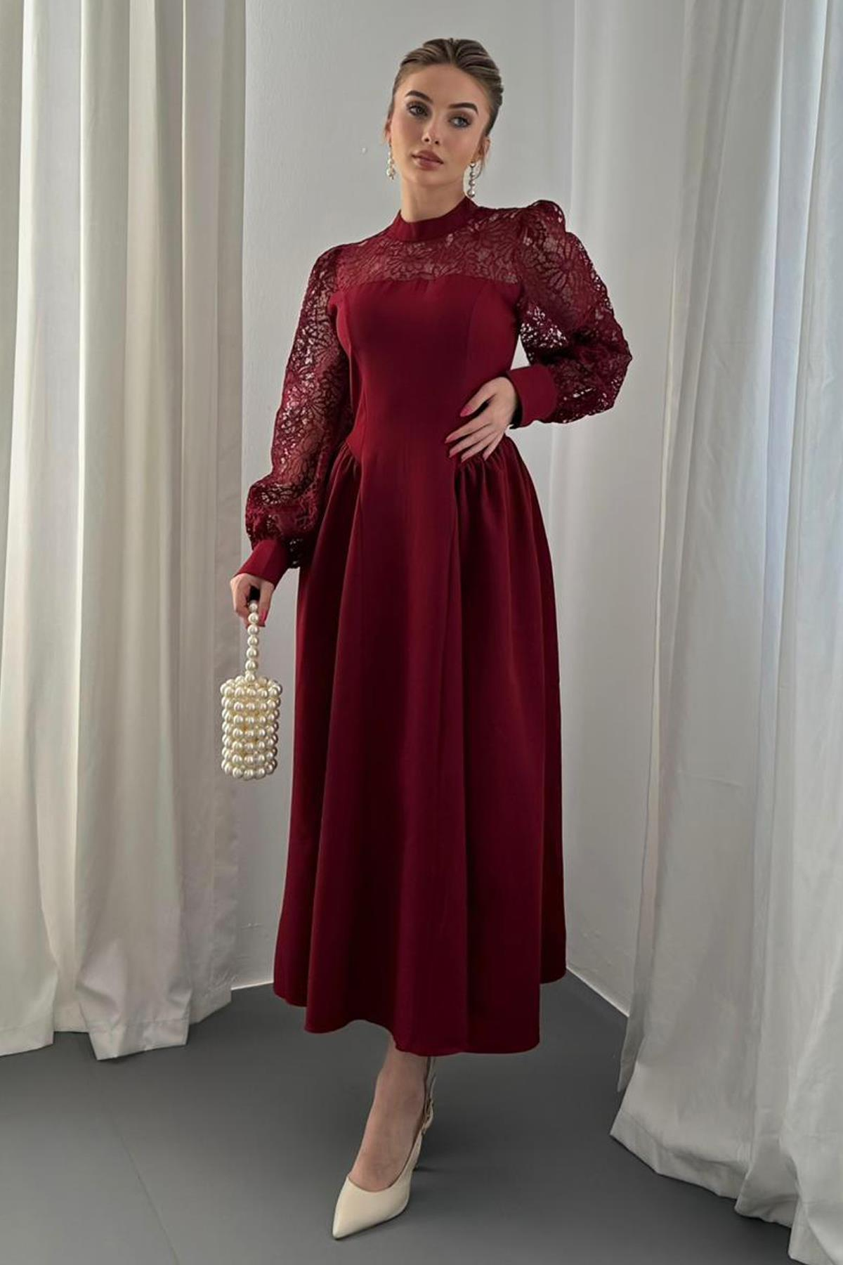 Dantel Garni Detaylı Atlas Elbise (9035)