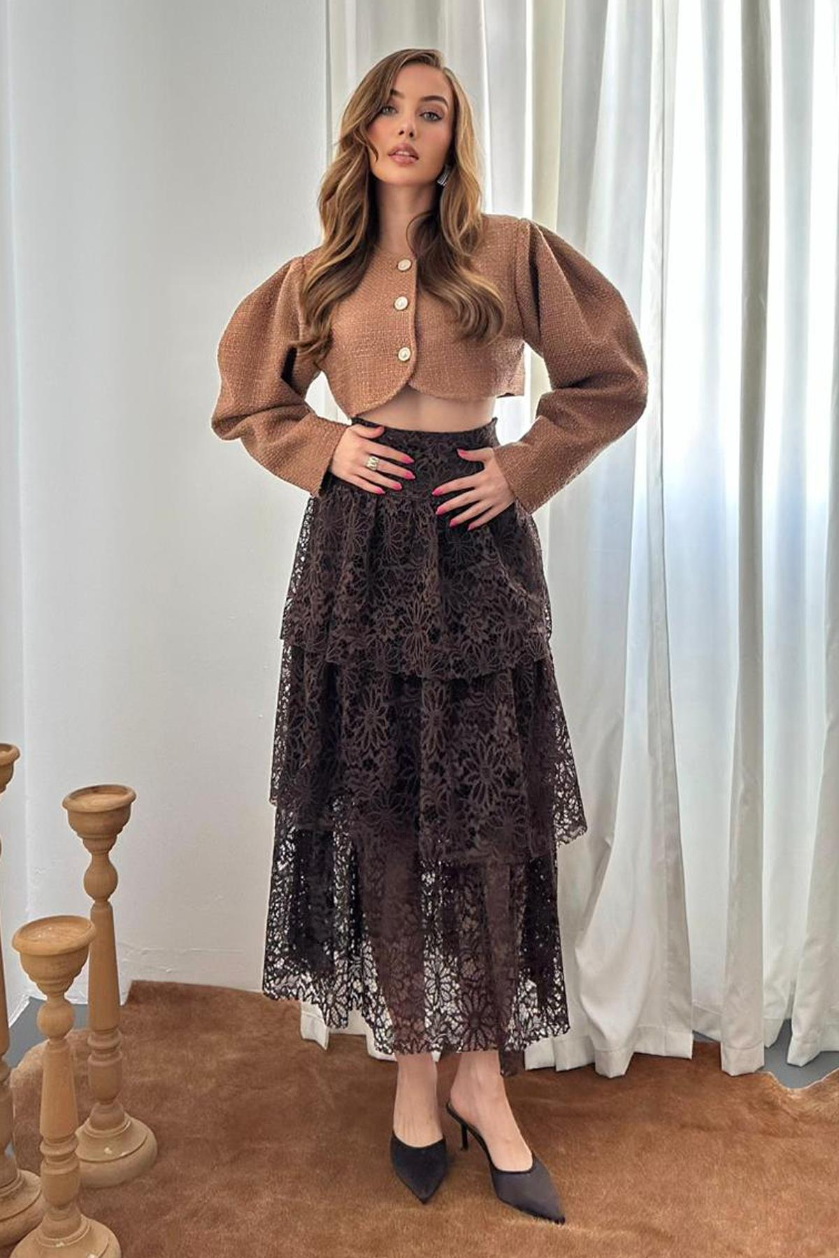Kat Kat Detaylı Astarlı Dantel Etek