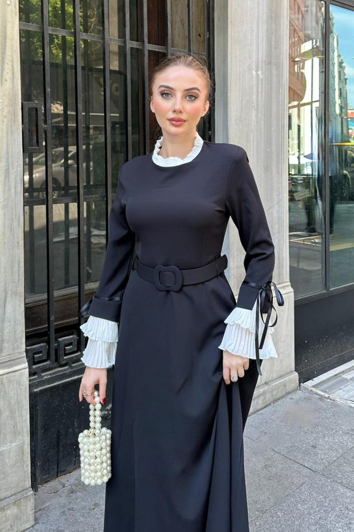 Yaka ve Kol Detaylı Kemerli Elbise (8201)